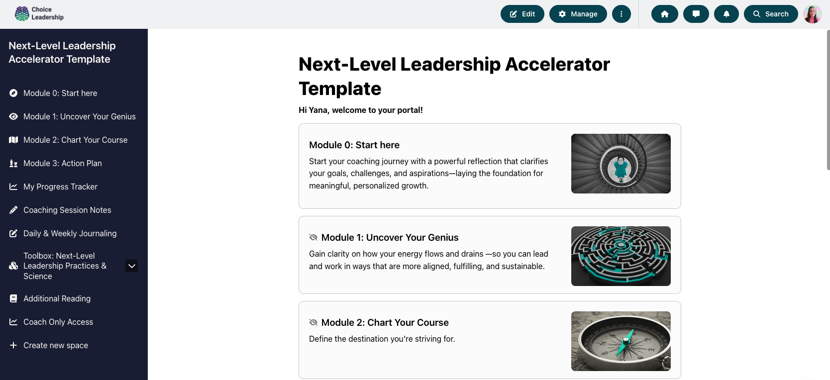 In this use case we highlight Denee Choice, women’s leadership coach. She developed a high-touch, 6-month private coaching program and created a personalized 1:1 template portal to support it.